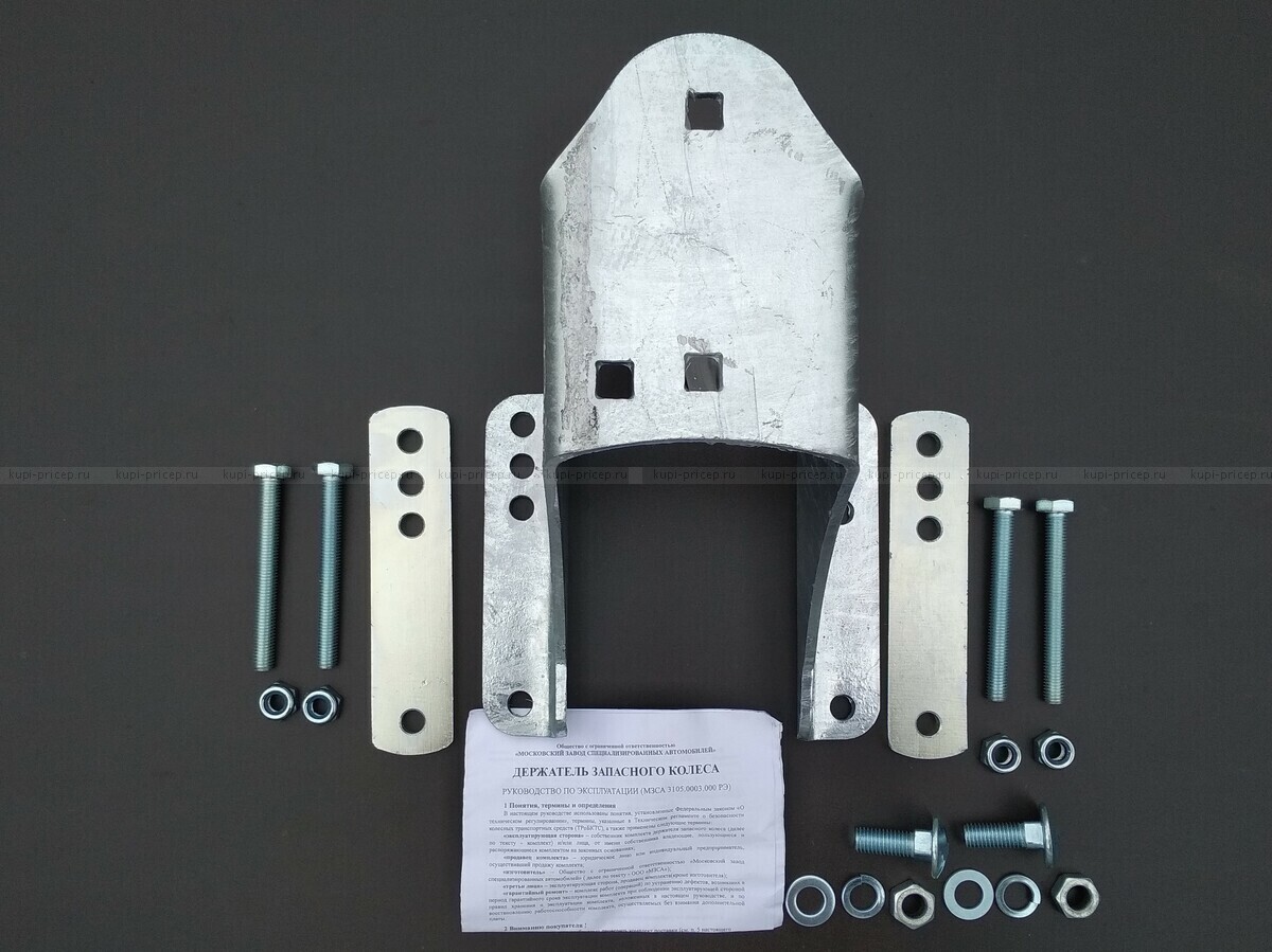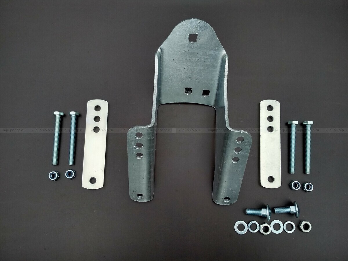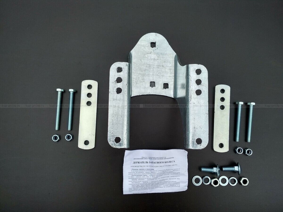 Кронштейн крепиться за переднюю часть рамы прицепа, а к нему на трёх болтах крепиться запасное колесо. Этот кронштейн можно использовать для любой модели прицепа.
