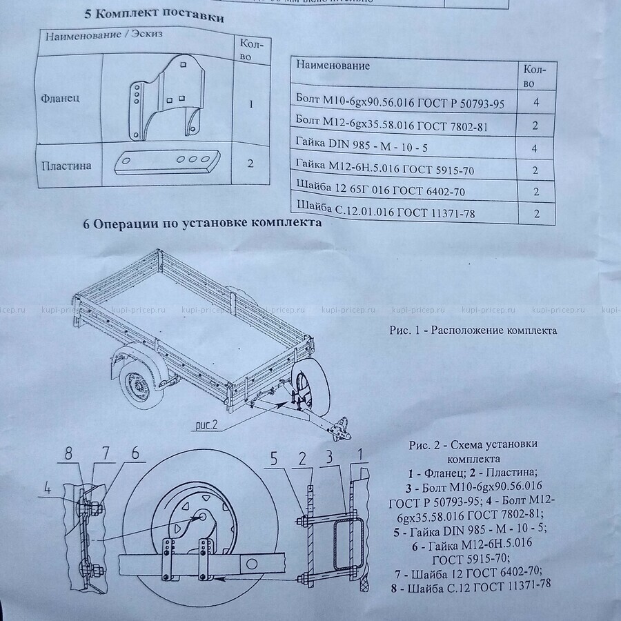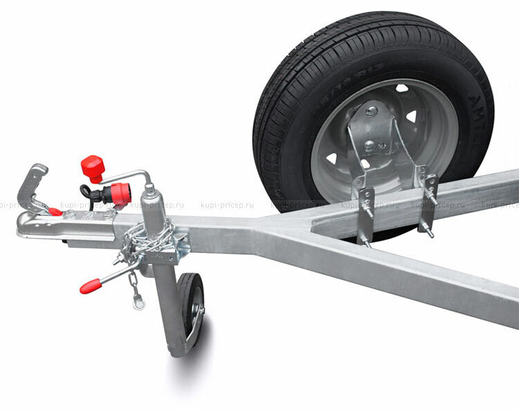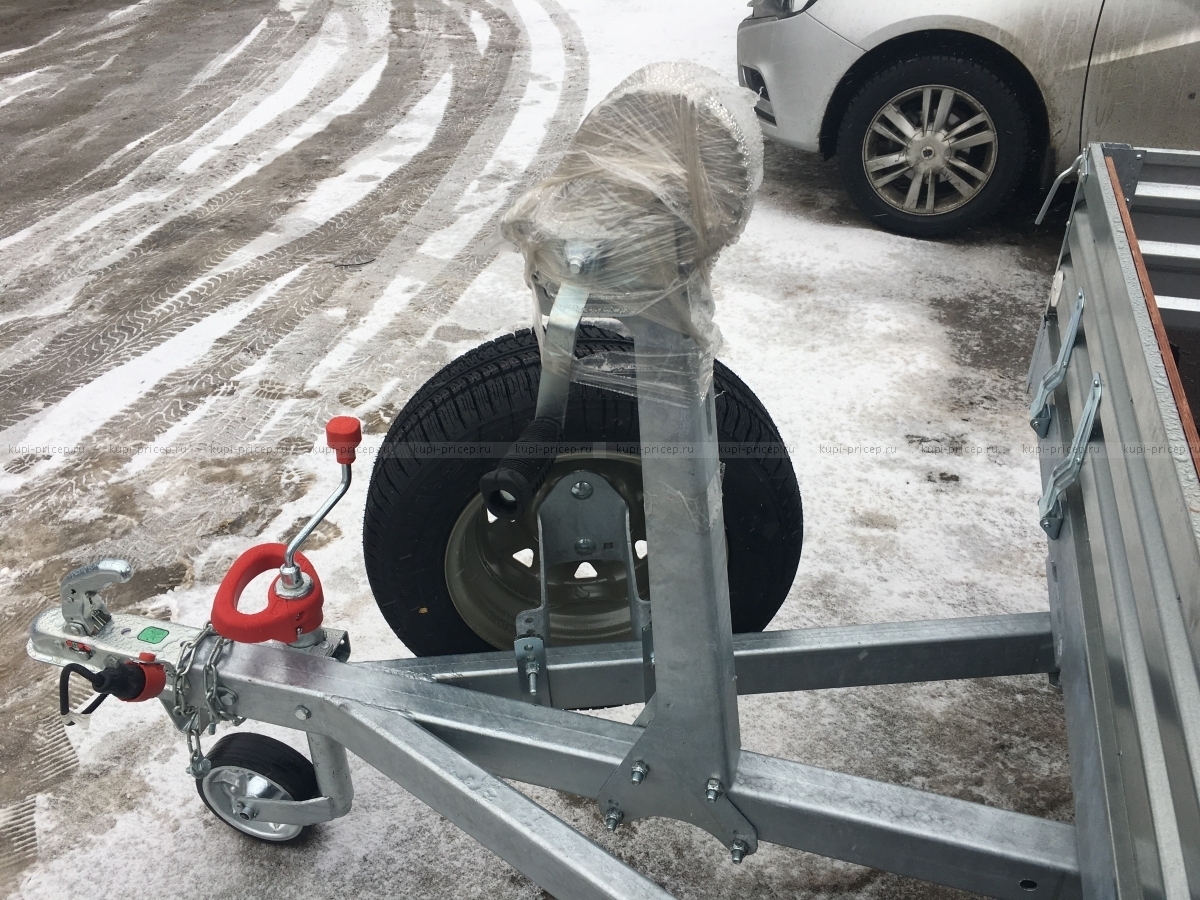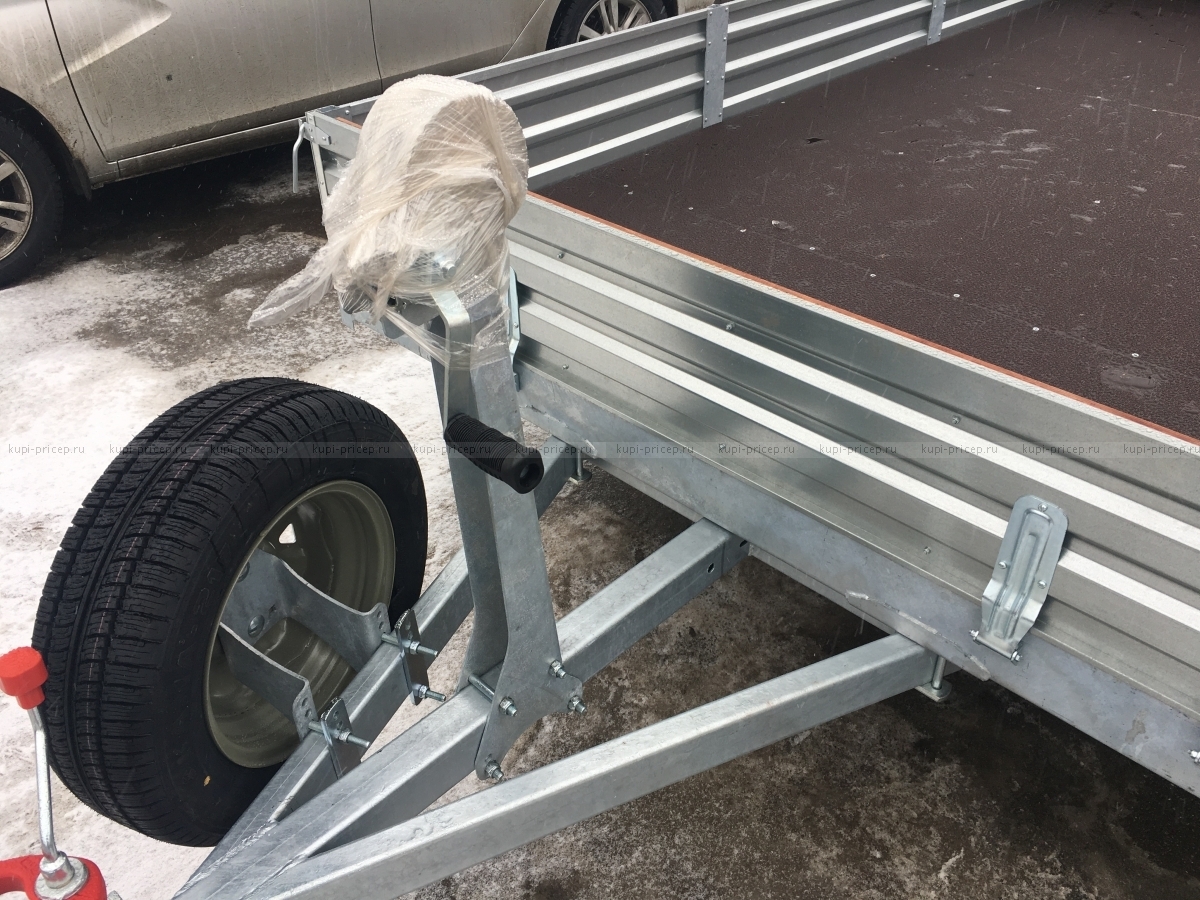 Кронштейн крепиться за переднюю часть рамы прицепа, а к нему на трёх болтах крепиться запасное колесо. Этот кронштейн можно использовать для любой модели прицепа.