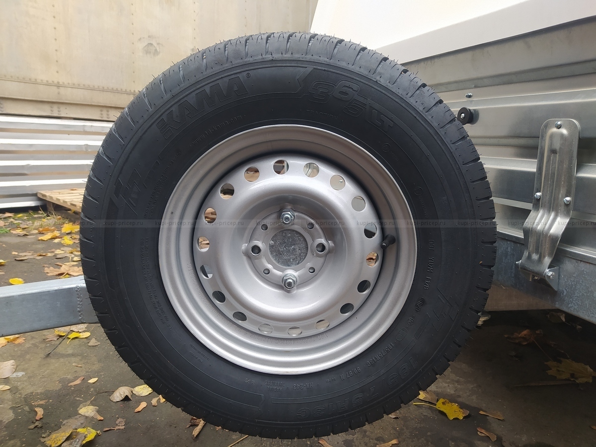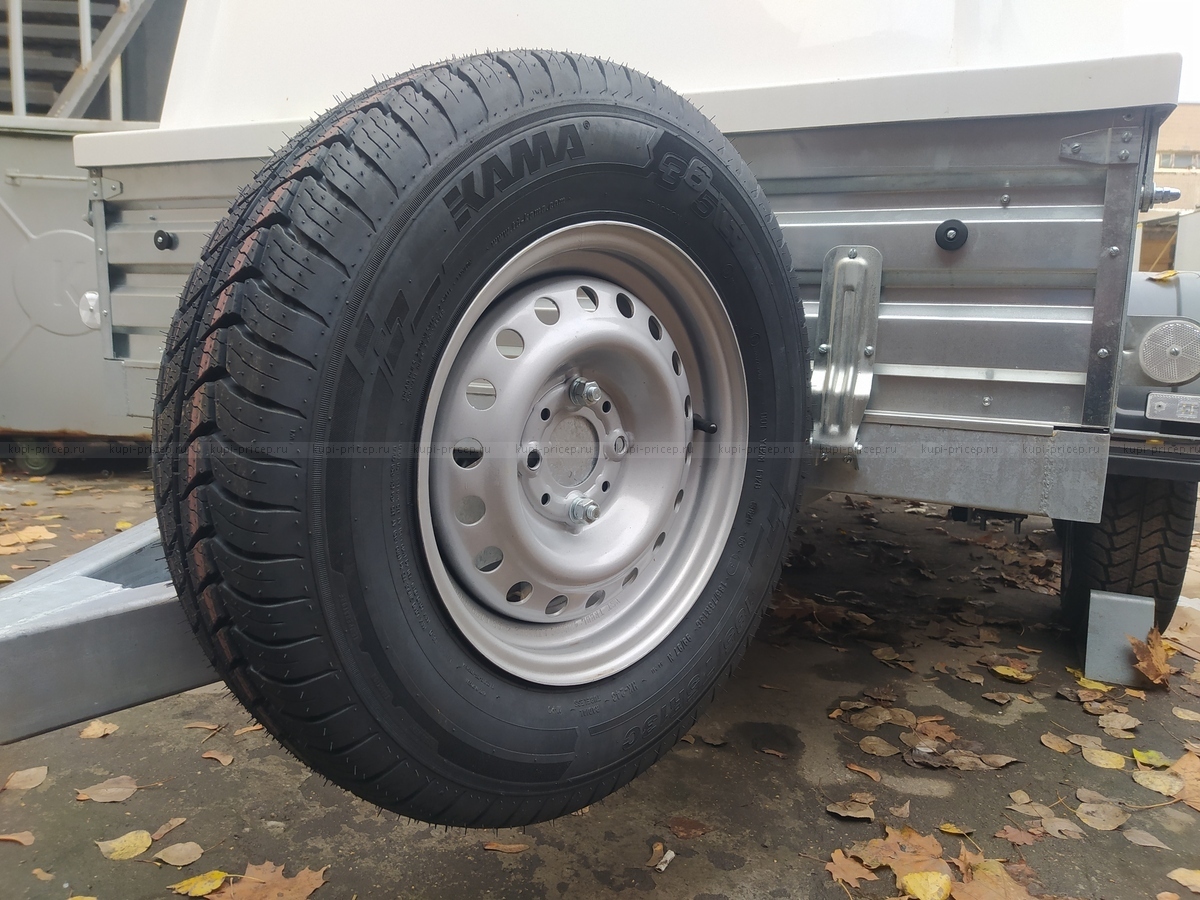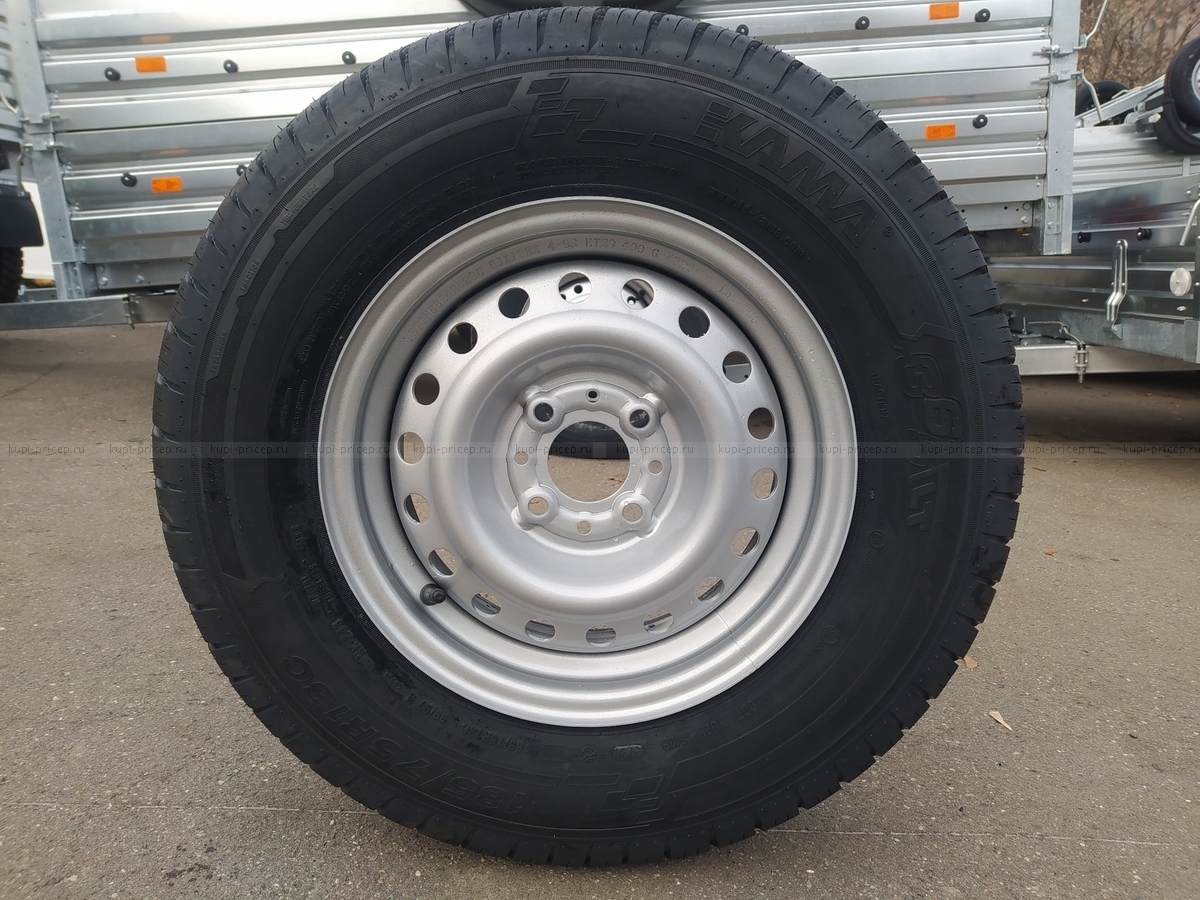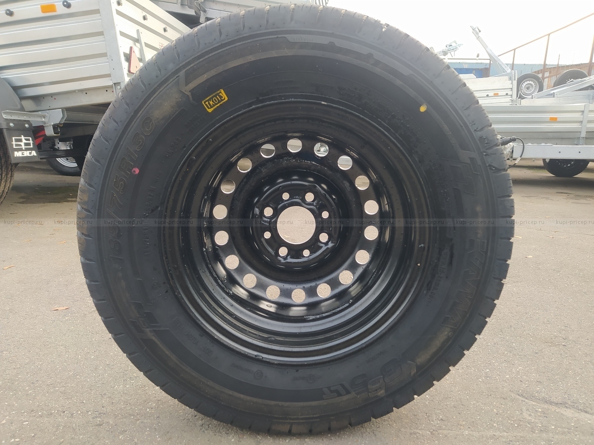 Запасное колесо 185/75 R13 С (с усиленным кордом) в сборе с такой же покрышкой, как и на вашем новом прицепе. Диск штампованный, радиус 13, 4×98.
